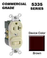 Break-off tabs on devices with switches permit conversion to separate feeds. 20 Amp, 120 Volt, Duplex Style Single-Pole / 5-20R AC Combination Switch, Commercial Grade, Grounding, Side Wired - Brown , UPC: 07847723342