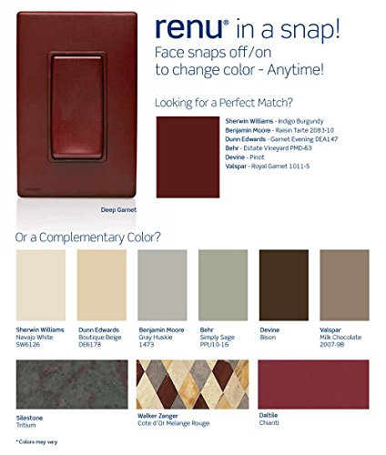 To complete the look, snap on a matching or contrasting Renu screwless wallplate (sold separately). Leviton Renu® Tamper-Resistant Outlet RER15-DG, 15A-125V, in Deep GarnetRenu in a snap! Renu is the smart new line of decorative electrical products from Leviton. Install Renu and get a fresh stylish look, plus the ability to change the color of any Renu device when you update a room. Designed for do-it-yourselfers, the line includes switches, outlets, GFCIs, dimmers, and sleek, screwless wallplates available in 20 designer colors to blend in or contrast with your decor. Refresh the color of any Renu device in a snap, without any rewiring or the need for an electrician. Just order a color change kit in the color you want, snap off the faceplate on the device and snap on the new face. Add a coordinating wallplate (sold separately) to finish the look. Renu fits your lifestyle and adapts to your changing taste.