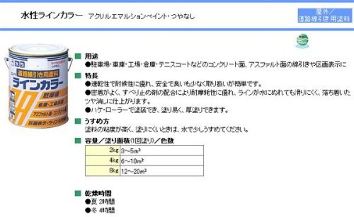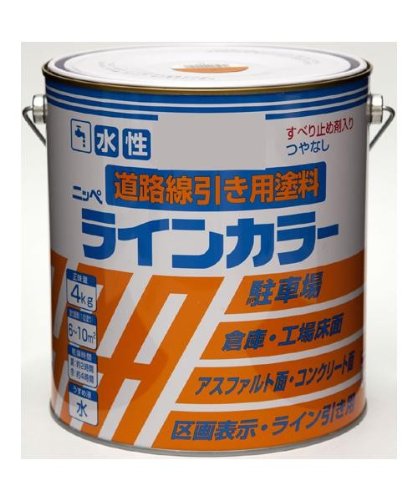 - 白の販売となります。お間違いのないようご注意ください。 駐車場・車庫・工場・倉庫・テニスコートなどのコンクリート面、アスファルト面の線引きや区画表示にお使いいただけます。つやなし。 内容量 4kg サイズ:個装サイズ:17×17×18cm 重量:個装重量:4600g 素材・材質:アクリルエマルションペイント 製造国:日本