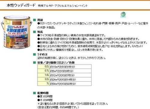 - 01・メープルの販売となります。お間違いのないようご注意ください。 ログハウス・ウッドデッキ・ラティス(木製フェンス)・ぬれ縁・門扉・板塀・雨戸・戸袋・ルーバーなど屋外の木部・木製品にお使いいただけます。 内容量 1.6L サイズ:個装サイズ:14×14×17cm 重量:個装重量:2200g 素材・材質:特殊アルキド・アクリルエマルションペイント 製造国:日本