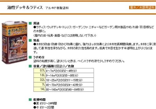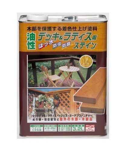 - 02・けやきの販売となります。お間違いのないようご注意ください。 ラティス・ウッドデッキ・トレリス・ガーデンファ ニチャーなどガーデン用木製品やぬ れ縁・羽 目板などの木部にお使いいただけます。 内容量 3.2L サイズ:個装サイズ:18×11×25cm 重量:個装重量:3800g 素材・材質:アルキド樹脂塗料 製造国:日本
