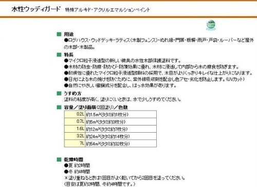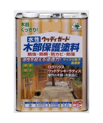 - 06・オークの販売となります。お間違いのないようご注意ください。 ログハウス・ウッドデッキ・ラティス(木製フェンス)・ぬれ縁・門扉・板塀・雨戸・戸袋・ルーバーなど屋外の木部・木製品にお使いいただけます。 内容量 3.2L サイズ:個装サイズ:18×11×25cm 重量:個装重量:3800g 素材・材質:特殊アルキド・アクリルエマルションペイント 製造国:日本