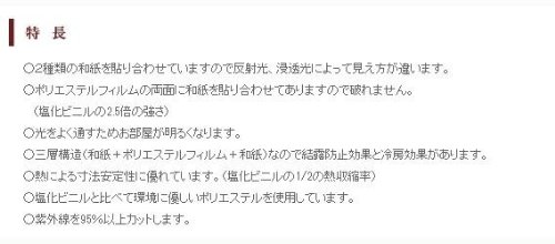 和紙本来の特性である吸放湿性、吸着性、断熱性を備えながら、破れない強度とでんぷん糊(のり)で貼れる特長を併せ持つ「人と建具にやさしい」素材。スタンダードやカラーとの組合せで住まいに変化を。