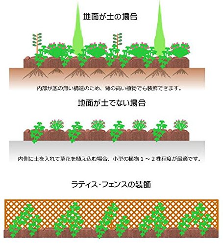 内部は底の無い構造で手軽に施工でき、花壇や通路の土止め、縁きり、ガーデンライトの設置やラティスの装飾など幅広く利用できます。