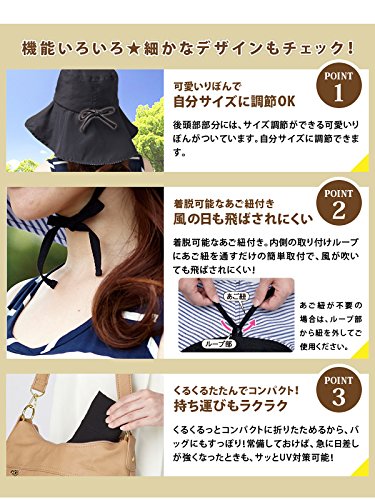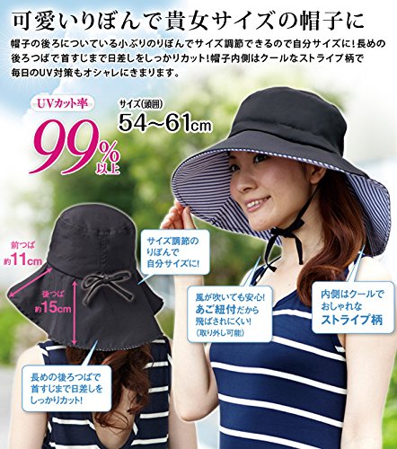 - お顔から首すじまでしっかりUV対策!後ろにあるりぼんで自分サイズに調整できます。風で飛ばされにくい、着脱可能なあご紐付き。くるくるっと折りたためばコンパクトになり持ち運びに便利。内側はストライプで涼しげなデザイン。UVカット率99%以上。サイズ・容量 ■商品サイズ:前つば/約11cm、後つば/約15cm■適応サイズ:頭囲:54~61cm■パッケージサイズ:約W19.5×L32×H8(ヘッダー5cm含む)■素材・成分:表生地:ポリエステル95%、綿5%裏生地:ポリエステル80%、綿15%、レーヨン5%