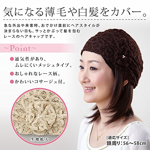 - カラー:ブラウン 単品販売になります。※画像は使用例の説明の為、本商品のカラーと異なる場合がございます。気になる白髪や薄毛をカバー。急な外出や来客時、おでかけ直前にヘアスタイルが決まらない日も、サッとかぶって髪を包むレースのヘアキャップ。通気性がありムレにくいメッシュタイプ。かわいいコサージュ付。洗濯は必ず「手洗い」で洗ってください。サイズ・容量 ■適応サイズ:頭周り56~58cm■パッケージサイズ:約 縦32cm×横13.5cm×厚み1cm(ヘッダー3.5センチを含む)■素材・成分:綿、ナイロン、レーヨン■パッケージ:P.P.袋