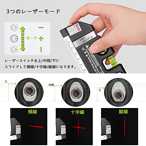 - 【3種類のレーザー光線】照射口のスイッチをスライドすることで、横線、十字線、縦線に切り替わって、自分のニーズに対して自由に選択ことができます。そして、目立つ赤色のレーザーは、はっきりと測定可能です。