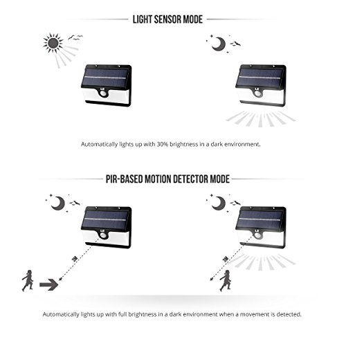 ・ライトセンサーモード:暗闇又は夜自動的に30%の明るさを提供します。ランタイムは、日差しの下で7~8時間充電した状態で約10時間連続点灯します。PIRモーションセンサーモード:動きを探知すると自動的に明るくなります。また、全く探知しないと電気は消えます。