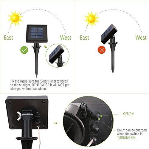 ・充電のため、ソーラーパネル(入力2V/150MA)が日差しに当たることを確保してください。また、スイッチを入れている場合でも充電ができます。