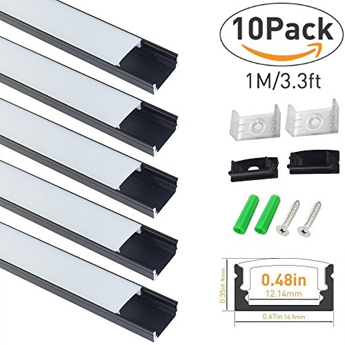 LightingWill LEDアルミチャンネルUタイプ 3.3 Ft/1M 12mm以下5050 3528 LEDライト用 カバー エンドキャップなどの付属品が付き ブラックチャンネル乳白色カバーTPU02B10(10本セット)