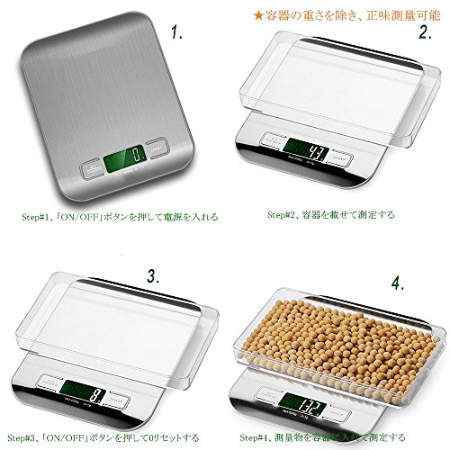- [多機能]:風袋引きとは容器や器の重さを予め引いて計量するための0リセット機能が付いてます。ボタン部分と重量測定部が同じ部分にあるので、ONボタンを押すときや風袋機能(0リセット)させたいときに,長押ししてしまうとその圧力のせいでで0表示にならないから、 押してすぐ離せばちゃんと0になりますので、ご注意ください。