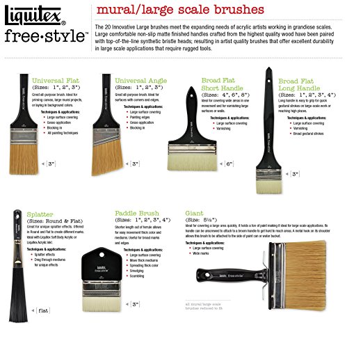 Perfect for professional artists, creative hobbyists, art students, art teachers. At Liquitex, we understand that it takes more than just good paint to produce a truly great piece of art. That’s why we’ve created our professional range of artist brushes. Liquitex Freestyle Brushes are the perfect tools for virtually any artistic application. Designed by artists for artists, these brushes have unique ergonomic handles and strong synthetic bristles that make them both comfortable and durable. If you work really large, our innovative ranges of large painting knives and brushes, in unique shapes and sizes, are designed to facilitate your creative expression on a grand scale. Liquitex Freestyle Universal Flat Brushes meet the expanding needs of acrylic artists working in grandiose scales. Large, comfortable non-slip matte finished handles crafted from the highest quality wood have been paired with top-of-the-line synthetic bristle heads; resulting in artist quality brushes that offer excellent durability in large scaled applications that require rugged tools. Ideal for large-scale work, varnishing. Available in varying sizes. Visit our Liquitex Amazon Storefront for full product assortment.