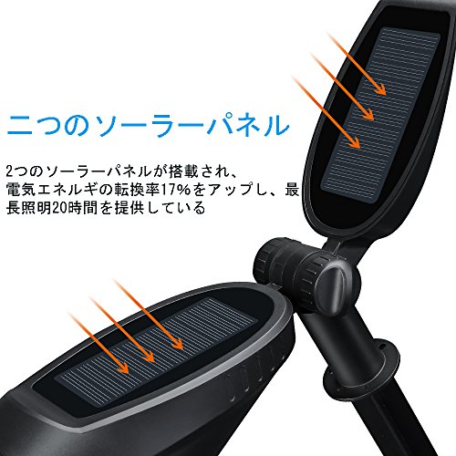 - 2つのソーラパネル:2つのソーラーパネルが内蔵され、電気エネルギーの転換率が17%を達成、長い照明時間を提供しています。