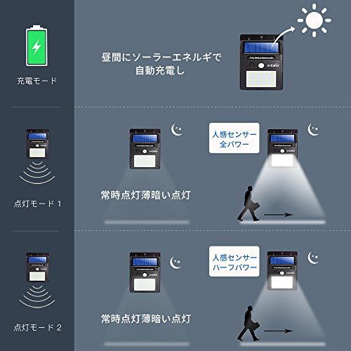 - 二つのモードがあります。1、全パワー,ひとがお通る時、明るい光で働き始めます。人が離れると、薄い光で働きます。2、ハーフパワー,人が通る時、全パワーよりハーフ弱い光で働き始めます。人が離れると、全パワーと同じのような薄い光で働きます。雲や雨が降る時、製品が充分充電できません。その時、ハーフパワーモードに設置すれば、省エネを達達するとともに、照明時間も延長できます。