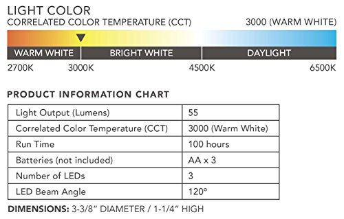 - 55ルーメン - 非常に明るく、長持ちするLED。3000K 温白色の光。