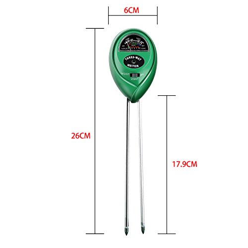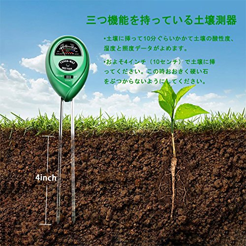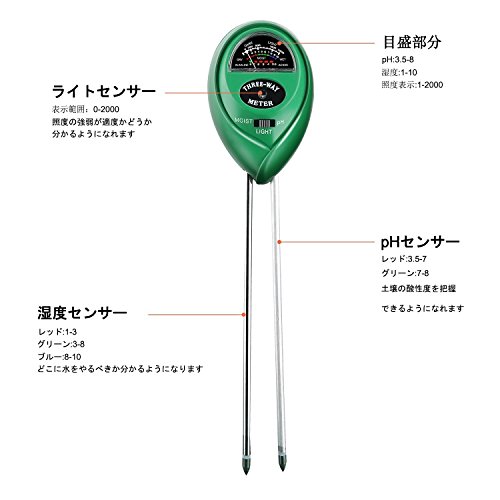 - ◎「3 in 1多機能」土壌の酸性度、湿度と照度を測るメーターで、園芸や家庭菜園などに非常に役に立つものです。pH範囲:3.5~8;湿度範囲:1~10;照度範囲:0~2000。
