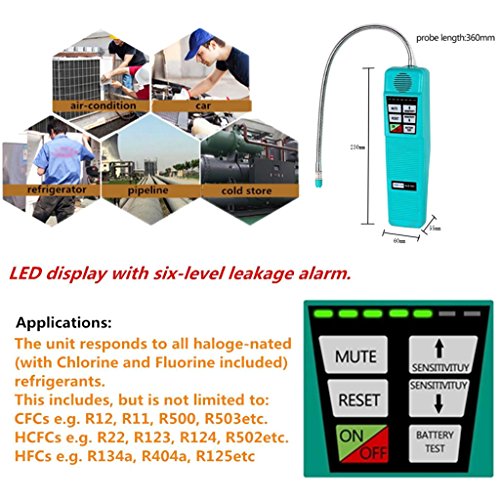 - などのR134a、R12、R410A、R22やR600Aなどのハロゲンリークを検出し、