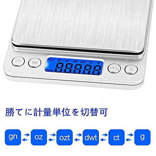 - 【高精度】超ミニで0.1G単位/3KGまで計れる精密デジタル秤です。ON/OFFボタンを押して、3kg以下のものを置いたら、すぐ重量の数値が液晶ディスプレイに表示されます。計量最低重量:0.5g。 誤差範囲:±0.3g。 6種な計量単位:G、OZ、OZT、DWT、CT、GN切替可。