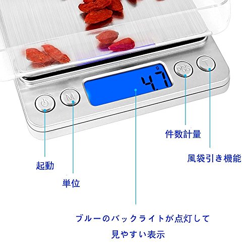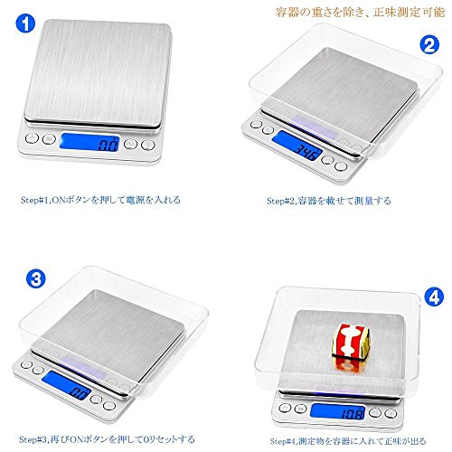 - 【風袋引き機能】電源を入れて、容器を載せると容器の重さが表示されます。そして、Tボタンを押すと、重量がゼロになり、容器を除いて品物の重量を測定することができて便利でしょう!