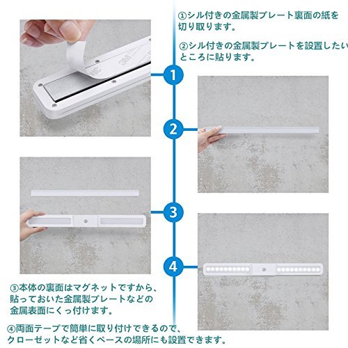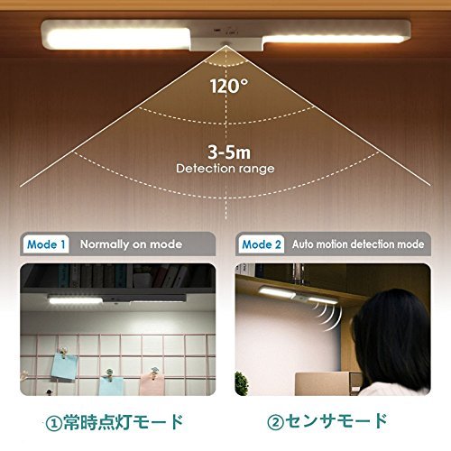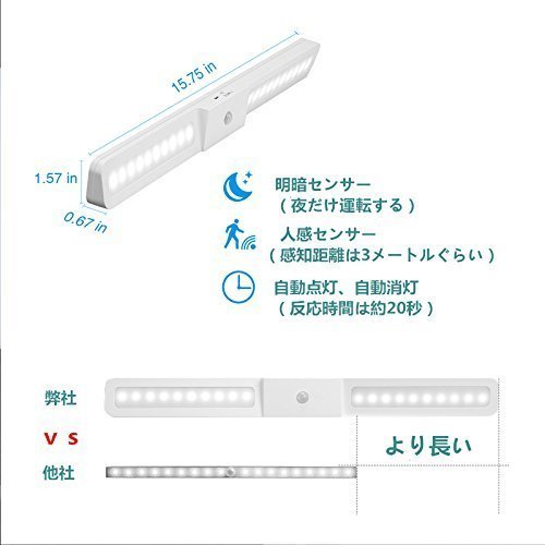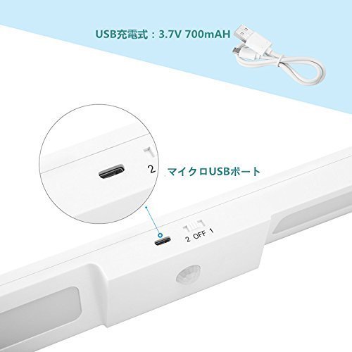 ①【人感センサー&光センサーを搭載】:人感センサーライトのPIRセンサー器と光センサー器が同時に作動し、昼と夜を認識します。そのため、昼間など本機の周囲が明るい場合、人間の動作を感知してもライトはオフの状態。夜間など暗い時には人が来ると反応(感知距離は3メートル程度)、LEDライトが自動点灯し、人がいなくなると約20秒後に自動消灯します。 ②【省エネなUSB充電式】:本機は充電式バッテリー(700mAh)を内蔵しておりmicroUSBケーブルを介して充電が可能です。充電ポートやUSBポート搭載の機器で充電されてください。20個の明るい白色LEDを搭載、省エネで環境に優しいLEDセンサーライトです。 ③【取り付け方法】簡単に取り付け、取り外しが可能です。磁石付きの本機を固定するため添付の接着板を使用することにより、本機をどんな場所にでも設置できます。(接着させる箇所は水気や汚れを拭き取ってから貼り付けてください)。本機を固定するために特別なツールは不要!ネジやナットなどの工具は必要ありません。 ④【適用場所範囲】軽量&ポータブルデザイン – バーの形をしたコンパクトサイズの理想的な夜の光。あなたのベッドルーム、バスルーム、キッチン、クローゼット、廊下、階段などを照らす機能を備えています ⑤LEDセンサーライトの感度に影響が無いように、3つのセンサーライトは同じ空間(狭い間隔で設置)や極端に湿度が高い所、蒸気など冷湯気などの出入り口に取り付けないでください。感度に影響する可能性があるため大変重要な事項となります。ぜひご注意ください。