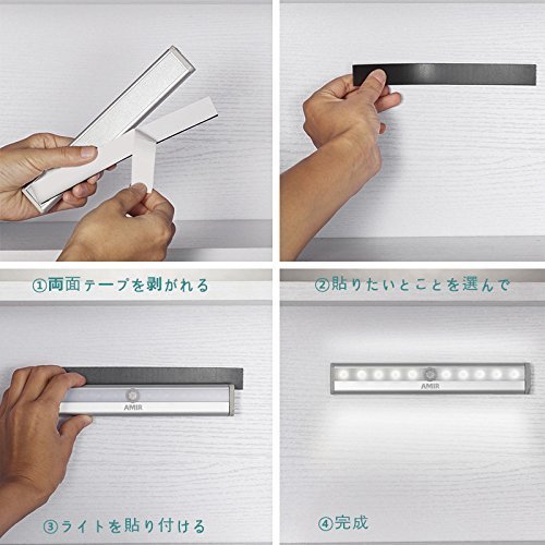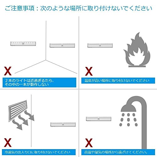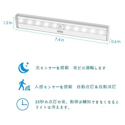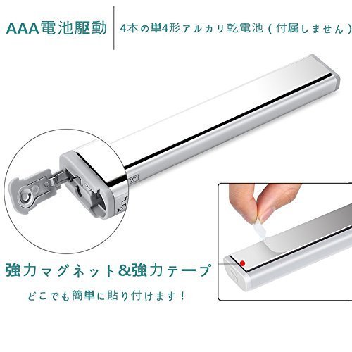 【人感センサー&光センサーを搭載】:人感センサーライトのPIRセンサー器と光センサー器が同時に動いて、昼と夜を認識できる、つまり昼間あるいは明るい場合に人間の動作を感知してもライトがオフの状態で、暗い時に、人が来ると急速に反応し(感知距離は3メートルぐらい)、LEDライトが自動点灯、人がいなくなると約15秒後に自動消灯。 【便利な電池式】:AAA電池駆動、4本の単4形乾電池(付属しません)。【高輝度】10個のLEDがパワフルな光を供給し、全光束50ルーメンと十分な明るさを確保できます 【3Mテープと強力マグネット付き】取付方法:ネジなどを要らなく、付属の強力テープで何秒だけでいい、どこでも簡単に貼り付けます!簡単に取り付けます。 【使用範囲が広い】人が近づくとふわっと光るので廊下/階段/玄関/クローゼット/キッチン/物置/寝室/押し入れ/廊下/作業間/地下室/屋根/駐車/車庫/お子供とお年寄りの部屋/ワードローブ/本棚/車内/テントなどの明かり取りに最適です。 ランプの感度に影響しないように、三つのランプが同じ空間や冷湯気の出入り口に取り付けないでください。これは大変重要です。ぜひご注意ください。
