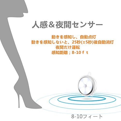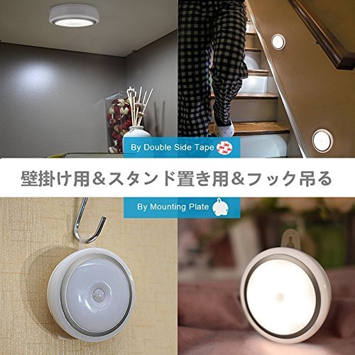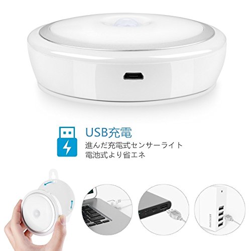 【仕様】 材料:ABS;サイズ:2.3 x 4.6 x 4.1インチ;色温度:4000〜4500K;入力電圧:DC5V ;白い光が部屋に満っていて、目に優しい、心を慰めて、長寿命で消費電力も少なく。 【三つの知能モード搭載】AUTOモード・ONモード・OFFモードが搭載されています。ON:常灯モード。OFF:消灯モード。AUTO:人感モード。 ONを押すとライトは常に点灯する。OFを押すと消灯する。AUTOを押すとライトは人感モードに入る。動きを感知し、自動点灯できる。動きを感知しないと、25秒(±5秒)後自動消灯する。ご注意:夜間だけ運転します。昼間でAUTOを押してもライトが点灯しません。 【三つの取り付け方法】①3M粘着テープ(付属)を使用して、壁などに貼り付けることができます。②吊り穴で、フックにも掛けることができます。③取り付けプレートで、机などの上に立ても大丈夫です。 【USB充電式多用途LEDライト】:内蔵の600mAhリチウム電池で電力を提供します。充電時間1-2時間、効率0.5W、完全充電後30日以上利用できます!モバイルバッテリー、PCのUSBポート、携帯電話の充電器などと非常に便利です。室内だけ利用可能 廊下、階段、ガレージ、ランドリールームなどで適用。 ランプの感度に影響しないように、二つのランプが同じ空間や冷湯気の出入り口に取り付けないでください。これは大変重要です。ぜひご注意ください。