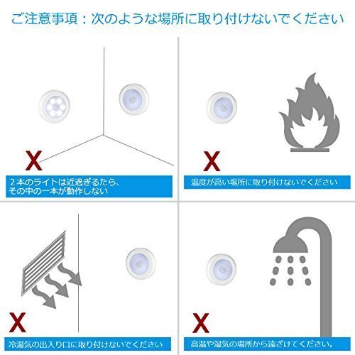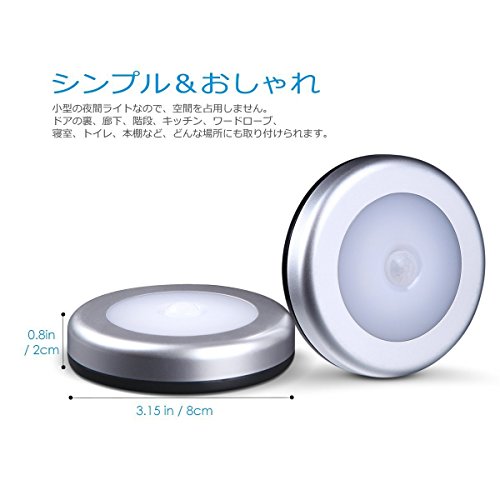 ①明暗と人感センサー LEDライト:動きを感知して自動点灯、自動消灯機能付。10フィート以内の動きを感知し、人に反応し、自動点灯できます。動きを感知しないと、15秒後自動消灯します。夜間あるいは暗い場所だけ運動できます。省エネの上に経済的、環境にも優しいです。 ②感知範囲:検出の距離が約2~3m、検出角度は垂直が約60度、水平が約120度。敏感に周囲の動きを感知できます。 ③配線ないデザイン:サイズ:8x8cm 材質:PC+アルミ素材 単4電池3本使用(電池が含めず)、電源や面倒な配線が一切不要! 3mの両面テープと強力なマグネット付き、さまざまな場所に簡単に設置ができます。 ④強力なマグネット磁石付き:マグネットがついているので、金属の部分に貼り付けることができます。 裏フタは反時計回りにスライドで開きます。 偽物にご注意ください。弊社の商品はAmazonより発送し、Amirの包装とログがあります。ランプの感度に影響しないように、三つのランプが同じ空間や冷湯気の出入り口に取り付けないでください。これは大変大切です。ぜひご注意ください。