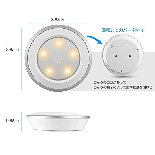 【仕様】:材質:ABS;LED数量:5LED;寸法:3.18 x 3.18 x 0.87インチ;重さ:138g;消費電力:0.5W;電圧:4.5V;取り付け:3m両面テープ/固定ねじ; バッテリータイプ:単三電池×3(別売);リモコン電池の種類:単4電池×2本(別売); 【どこにでも装着できるLEDライト】3mの両面テープと固定ねじが付き、面倒な電気配線が要りません。どんな場所にも取り付けられます。持ち運びやすいので、停電や非常時に、緊急時用ライトとして使えます。 【明るさが2階段調光可能】リモートコントロールで好きな明るさが調節可能です。【操作簡単】小型リモコンに4つの大きなボタンがあります。ON / OFF / LOW / TIME。リモコンの効果的な受信範囲は10メートルです。1つのリモコンは同時に複数のライトを制御することができます。360度角度をコントロールライトられます。ご注意:壁などの障害物が多くと受信効果に影響があります。 【各所で自由に設置】台所/階段/クロゼット/キャビネット/玄関/廊下/物置/倉庫/寝室/赤ちゃん室/作業間/地下室/屋根/駐車/車庫/トランクなどの場所に取り付けます。
