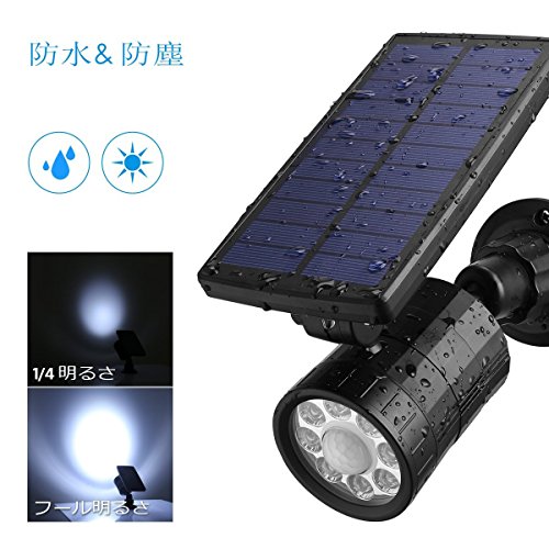 【電気代は要らないソーラーライト】ソーラーパネルは昼間で太陽エネルギーを吸収し、電力に転換し、バッテリーに蓄え、夜に自動的に点灯します。電気代は要りませんし、配線する必要もありません。運動感知センサーが内蔵され、人が来ると自動的に点灯し、人がいない時に弱いライトで点灯或いは消灯する省エネタイプです。 【簡単設置】:電源や配線は不要!壁への固定は、付属したネジで簡単に固定できます。 【より安全、高品質な外観設計】- ソーラーライトの回路基板はIC保護モジュールによって、過充電、過放電、爆発を防止します。ソーラーライトの外部素材はアルミニウム合金シェルのため、丈夫で長くお使いいただけます。保護レベルはIP65。 【四つの知能モード】:①25%のライト常時点灯モード 8-10時間、②50%のライト常時点灯モード 4-6時間、③人感センサ+薄光 600回、④人感センサ 1000回