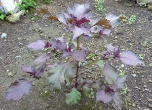 - 葉が縮れ、赤紫色の品種です。梅干しや紅しょうがの着色、漬け物等に利用されます。