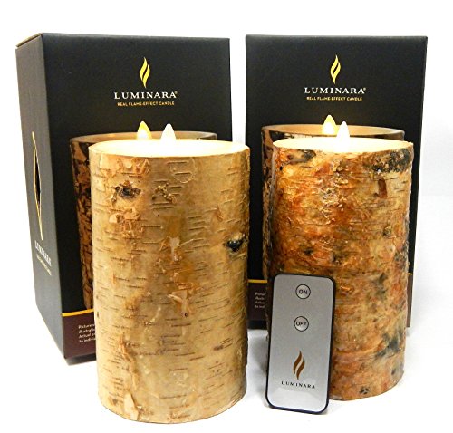 2pc Luminara Birch Bark Flameless Candle 7 " in。TallワックスピラーセットW/Realバーチ木製4 " in。直径|ボーナスリモートコントロール含ま