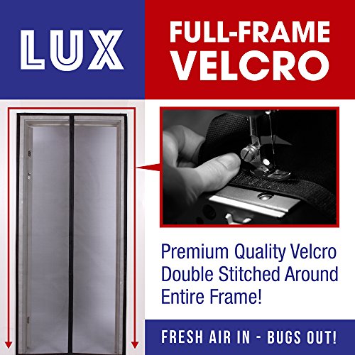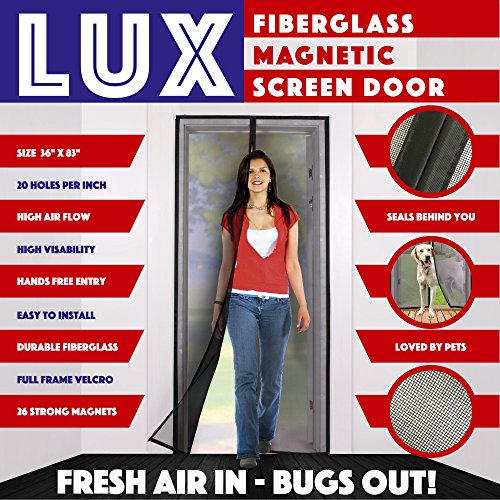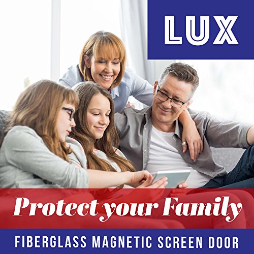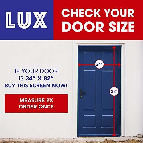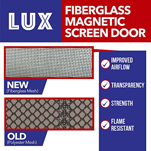 - 当社の特許出願中のLUXマグネットスクリーンドア:このドアの網はファイバーグラス製の網素材を使用し、市販されているもので最も強く、従来のポリエステル製網よりも最大10倍の強度を持ちます。最大で34インチ×82インチまでのドアに適合。まず測定してください。