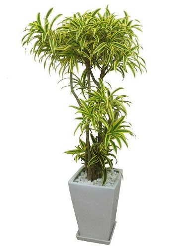 そのまま飾れる陶器鉢植え。黄覆輪の葉が明るくお部屋の雰囲気も明るくしてくれます。 明るい斑の入った葉の模様と、枝分かれした樹形が人気のソングオブインディアを、スクエアタイプの陶器鉢にアレンジしています。 陶器鉢の色はホワイトおよびブラックよりお選び頂けます。 ソングオブインディアは、他の斑入りの植物よりかは日当たりが多少悪くても班が消え難い植物です。 虫もあまり付きにくく、多少水やりを忘れた位では枯れない丈夫で育てやすい観葉植物です。