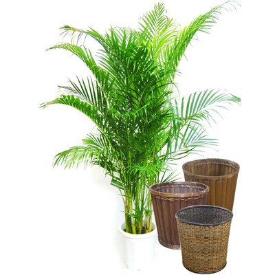 ボリュームたっぷりでトロピカルムード満点のお得な植物です。ボリュームたっぷりの観葉植物の人気種です。黄緑色の羽状葉が優雅な株立ち性のヤシで観葉植物の中でもよく知られている代表的な種類です。成長すると幹に節ができタケのようになり、また、葉の中央脈と葉柄の部分が黄色い為に、和名はコガネタケヤシと名づけられています。鉢カバーはオプションにて選択後にカートに入れてください バスケット01細かく編みこまれた模様が美しいバスケットです。クセも無くさまざまなインテリアとの調和も良いバスケットです。