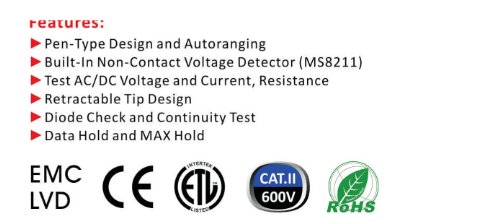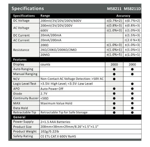 - パッケージ内容:1 * MS8211メーター、1 * テスターリード、1 *テスタークリップ、1 * 取扱説明書(英語版)