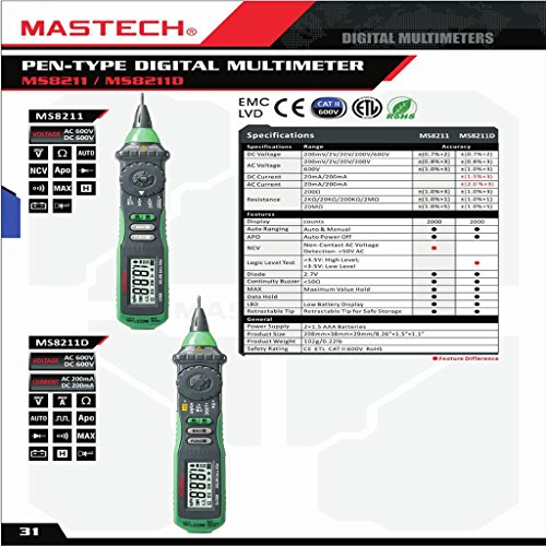 MASTECH デジタル マルチメーター DMM汎用計測器 AC電流・電圧測定 DC電流・電圧測定 抵抗測定 ペンタイプ 手持ち式 操作簡単 MS8211D