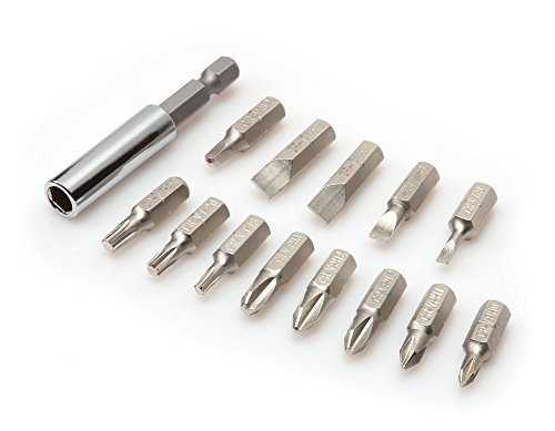 3-Position ratchet drive: forward, fixed, and reverse. 12 Bits and extension adapter store conveniently in handle. Rugged chrome vanadium steel bits. 13-Piece 1-inch screwdriver bit sizes: flat: 1/8-inch, 3/16-inch, 1/4-inch (2-pieces). Phillips: #0, #1, #2 (2-pieces). #3 star: SD-15, SD-20, SD-25. Square: #2 1-piece 2-5/16-inch magnetic bit holder.