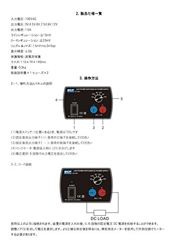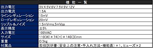 ●出力電圧:3V,4.5V,6V,7.5V,9V,12V●出力電流:1.5A●ラインレギュレーション:15mV●ロードレギュレーション:20mV●リップル&ノイズ:1.5mVrms,5mVpp●表示精度:±5%●入力電圧:100VAC●サイズ:110(W)×74(H)×140(D)mm●重量:0.3kg●付属品:取扱説明書(安全上の注意・手入れ方法・機能表)×1、ヒューズ×2