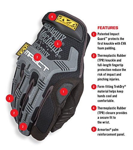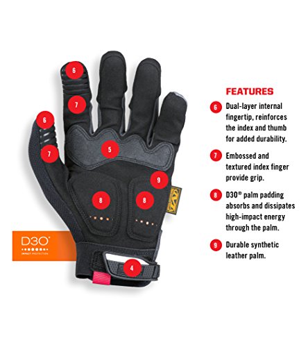 - M-PACTグローブのトレードマークでもある、トップ部のTPR(サーマル・プラスチック・ラバー)により、 ナックル部の保護と振動吸収を実現。手のひら部分に採用されたPORON・XRD・がインパクトレンチなどのハンドツールの振動や衝撃の緩和