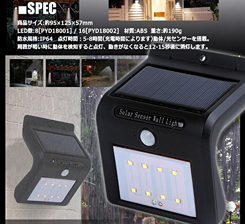 MIRACLE 電気代0円 防水IP64 センサーソーラーライト 動体検知 自動 点灯 消灯 (LED数8個タイプ) MC-PYD18001-08