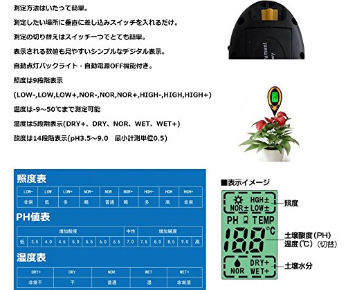 土壌酸度(14段階):pH3.5~9.0(最少表示0.5、精度±0.5)