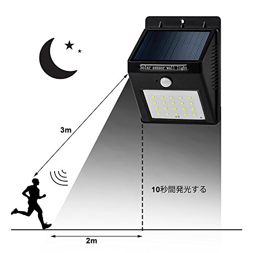 明暗と人感センサー:人感センサーライトは感知領域に出入りすることにより、自動的に点灯や消灯することできます。3メートル以内に動態を感知した時、光が点灯します。感知範囲外に移動すると光が約15秒後に消えます、昼間と光量が充分の場合は自動点灯になりません。省エネ、環境にも優しいです。