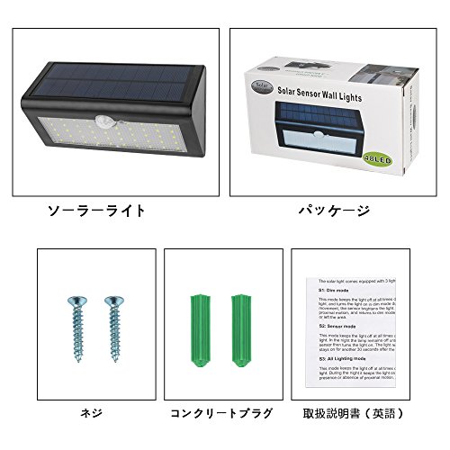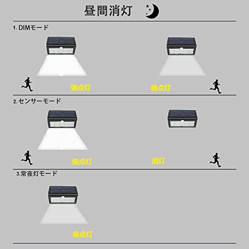 3つのモード:DIMモード:暗くなるとライトは薄暗く自動点灯しますが、人が近づくとセンサー感知でライトが明るくなり、強点灯約30秒します。動きが検出しないとまた薄暗く点灯状態に戻ります。センサーモード:普段は消灯しており、3メートル以内に動き検出されたら、強点灯約30秒します。動きが検出されないと消灯します。常夜灯モード:暗くなるとライトは薄暗く自動点灯します。昼間と光量が充分の場合は自動点灯になりません。