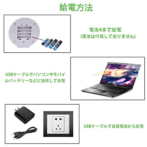 - 2つ充電方法:USBケーブルでパソコンや携帯電源などに接続して給電し、単4電池4本で給電してもいいです。(USBと電池で同時に給電できないようにご注意してください)