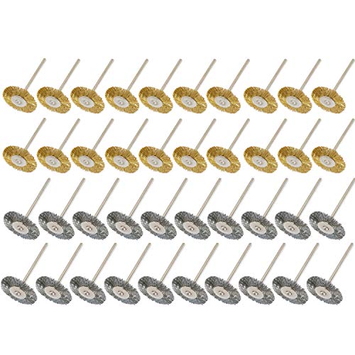 JINTONG 2種類真鍮ワイヤーブラシ& 鋼ブラシ ロビンソンブラシ ホイール型 ワイヤーホイールブラシ 研磨ブラシ 研削ブラシ 毛研磨ブラシ ドレメル 回転ツール アクセサリー 【2.35mm軸】40個入り