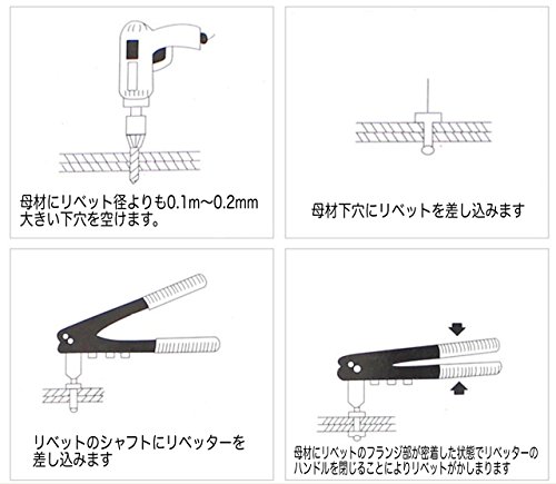 - リベット径: 4.0mm ・リベット長:約13mm ・下穴寸法: 4.1~4.2mm ・かしめ板厚:6.4~9.5mm