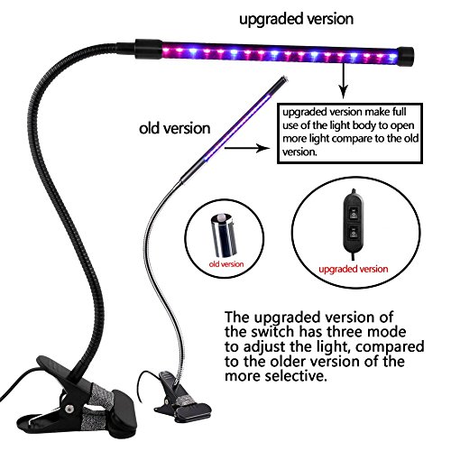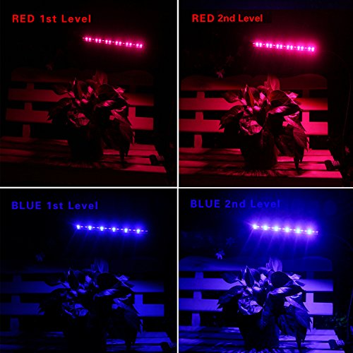 - 3種類点灯モード(青色光、赤色光、赤青色光)があり、スイッチで簡単に点灯/消灯、自由に強度の変換ができる。赤色光は、根茎の生長、開花、果実、開花期間延長を促進できます。青色光は、光合成をさらに促進出来ます。