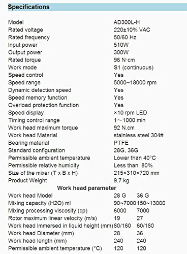 220?10% VAC 50/60 Hz 510W Lab Homogenizer Disperser Mixer AD300L-H 5000-18000rpm Digital Display 28 & 36G