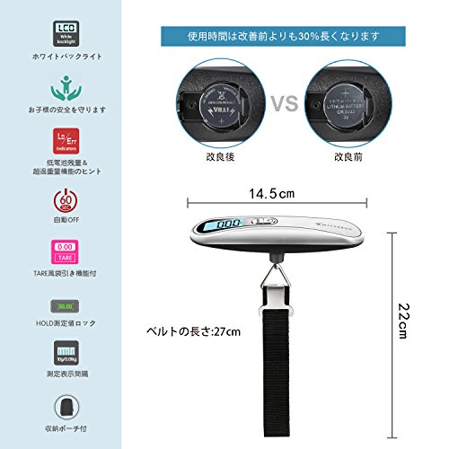 - 【簡易操作】スーツケーススケールは測定完了後、自動的に測定値をロックします。風袋引き機能も付き、旅行 はかりは60秒使用しない場合は自動的に電源OFFになり、電池を節約します。