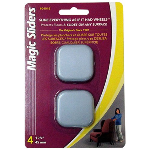 Magic Sliders move everything as if it had wheels. Protects floors from dents and scratches when moving heavy furniture for chores like painting or cleaning. Moves up to 2500 lb on any surface. Easy self-adhesive installation. As seen on TV. No. 04045: Size: 1-3/4", Shape: Square, Attachment Method: Self-Adhesive, Material: Plastic, Type: Slider, Color: Gray, Pkg Qty: 4, Package Type: Card ---- 1. 海外直輸入品となりますので、新品であっても、パッケージに多少のダメージがある場合もございますが、商品本体には問題ございませんのでご安心ください。2. 日本国内でのメーカーによる製品保証等は適用されません。3. パッケージや、説明書等は、英語表記となります。